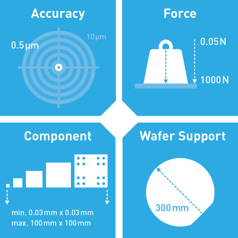 The system is ideal for all types of precision die bonding and flip chip applications at chip and wafer level. This includes complex 2.5D and 3D IC packages, Focal Plane Arrays (i.e. image sensors), MEMS/MOEMS, and more.