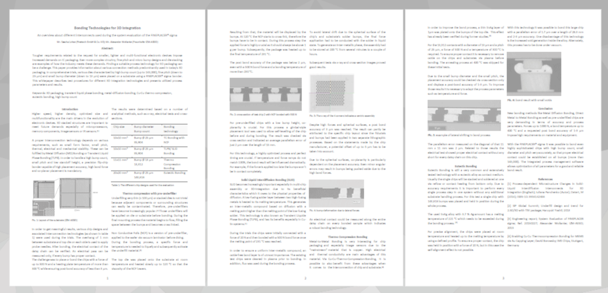 Abstract: Tougher requirements related to the request for smaller, lighter and multi-functional electronic devices impose increased demands on IC packaging. Ever more complex circuitry, fine pitch and micro bump designs and die stacking are examples of how the industry meets these demands. Finding a suitable process technology for 3D packaging can be a challenge. This paper provides information about various connection methods predominantly used in today’s 3D packaging. In comprehensive trials, various dies characterized by high bump count (up to 143,000), fine pitch (down to 25 μm) and small bump diameter (down to 13 μm) were placed on a substrate using a FINEPLACER® sigma bonder. This whitepaper describes test procedures for different 3D integration technologies and presents utilized process parameters and results.