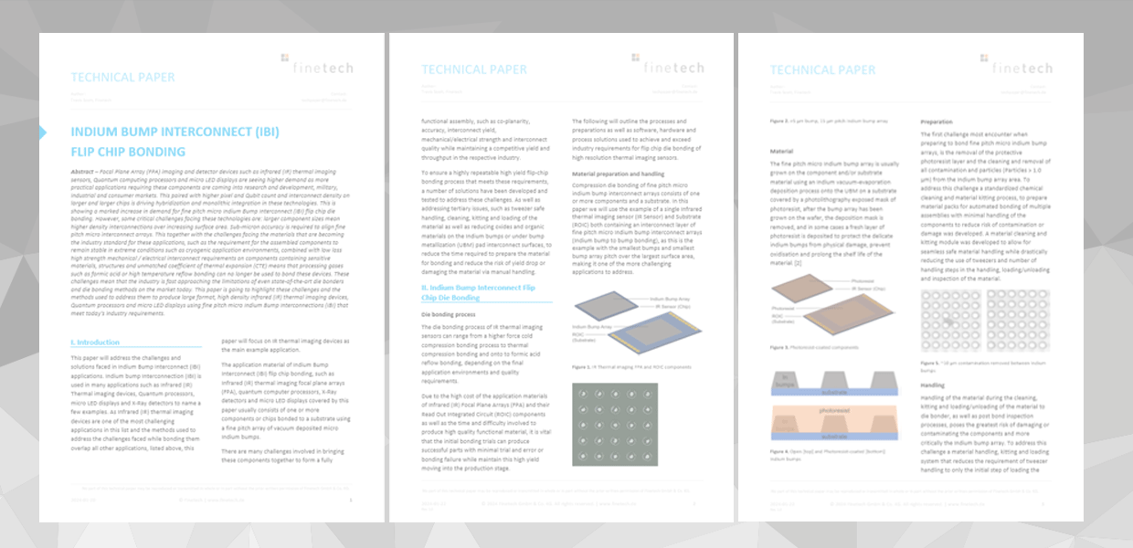 This together with the challenges facing the materials that are becoming the industry standard for these applications, such as the requirement for the assembled components to remain stable in extreme conditions such as cryogenic application environments, combined with low loss high strength mechanical / electrical interconnect requirements on components containing sensitive materials, structures and unmatched coefficient of thermal expansion (CTE) means that processing gases such as formic acid or high temperature reflow bonding can no longer be used to bond these devices. These challenges mean that the industry is fast approaching the limitations of even state-of-the-art die bonders and die bonding methods on the market today.