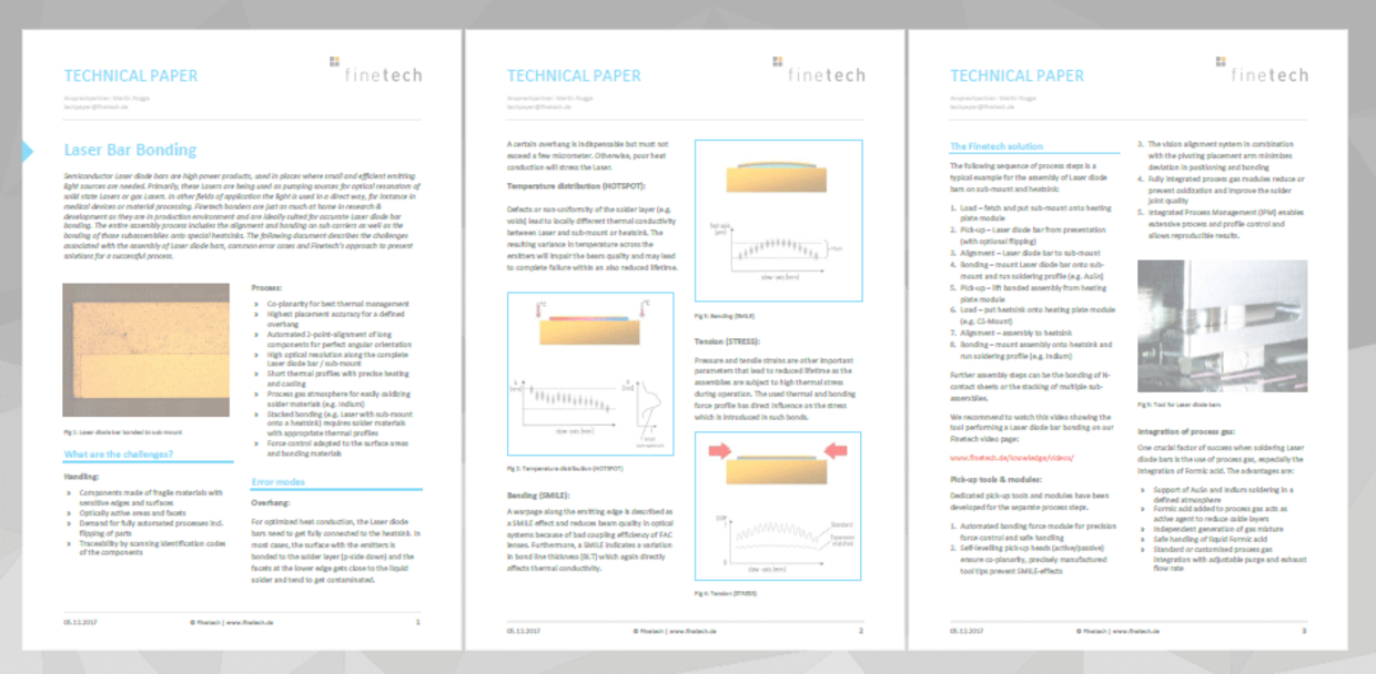 Abstract: Semiconductor Laser diode bars are high power products, used in places where small and efficient emitting light sources are needed. Primarily, these Lasers are being used as pumping sources for optical resonators of solid state Lasers or gas Lasers. In other fields of application the light is used in a direct way, for instance in medical devices or material processing. Finetech bonders are just as much at home in research & development as they are in production environment and are ideally suited for accurate Laser diode bar bonding. The entire assembly process includes the alignment and bonding on sub carriers as well as the bonding of those subassemblies onto special heatsinks. The following document describes the challenges associated with the assembly of Laser diode bars, common error cases and Finetech’s approach to present solutions for a successful process.