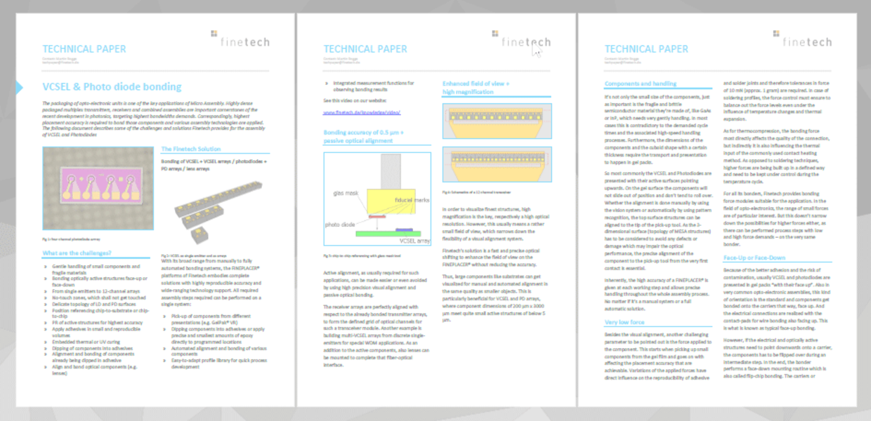 Abstract: The packaging of opto-electronic units is one of the key applications of Micro Assembly. High-density packaged multiplex transmitters, receivers and combined assemblies are important cornerstones of recent developments in photonics, targeting high bandwidth demands. Correspondingly, highest placement accuracy is required to bond these components and various assembly technologies are utilized. This document describes some of those challenges and the solutions Finetech provides for the assembly of VCSEL and Photodiodes.
